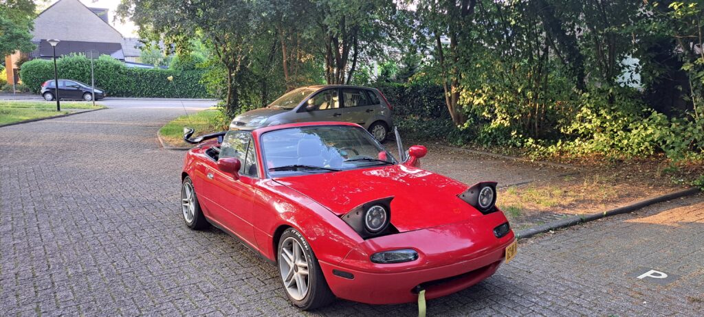 Een rode Mazda MX-5 NA uit 1993 met karakter.
